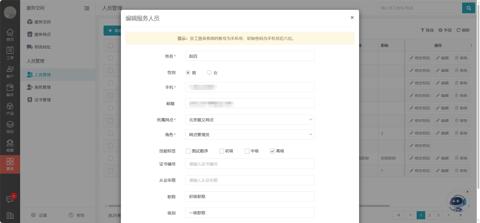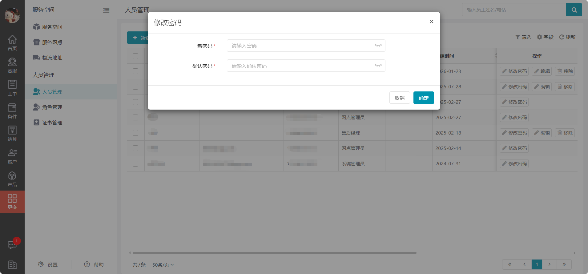 进入人员管理页面,点击【修改密码】,即可对于忘记密码的服务人员进行快捷修改密码。