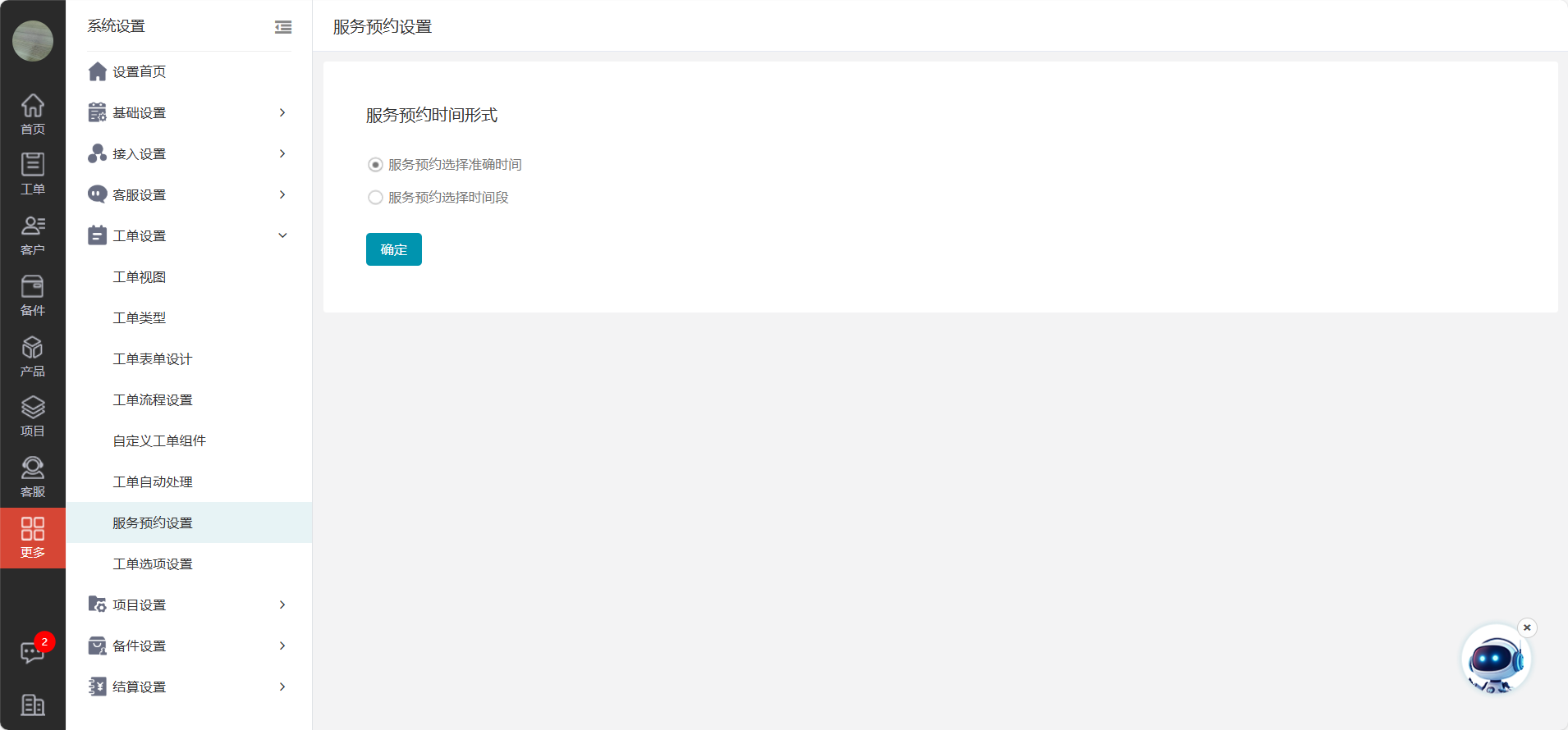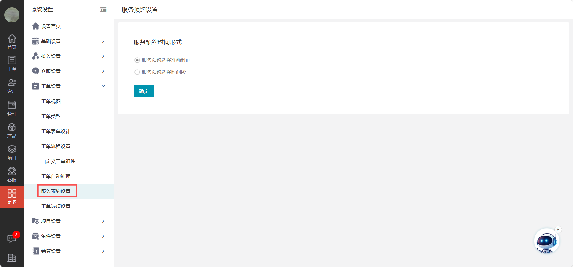 说明:可以设置工单预约客户时是选择准确时间还是时间段。