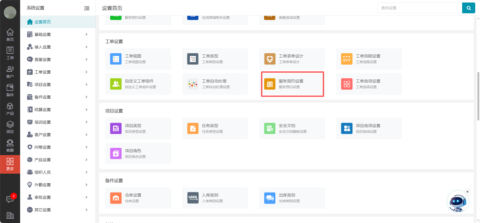 进入服务管理系统Web端首页,点击左侧主导航【更多】按钮,点击【系统设置】,在系统设置中找到【工单设置】,点击【服务预约设置】,即可进入服务预约设置页面。