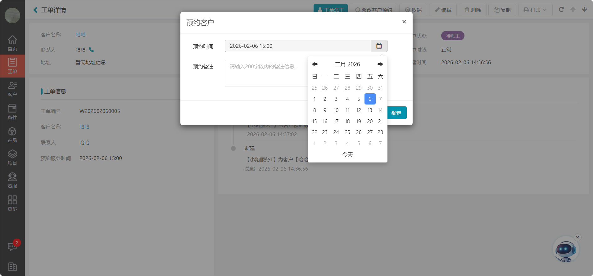 如果选择了准确时间的形式,则工单进行预约客户时选择的是准确时间。