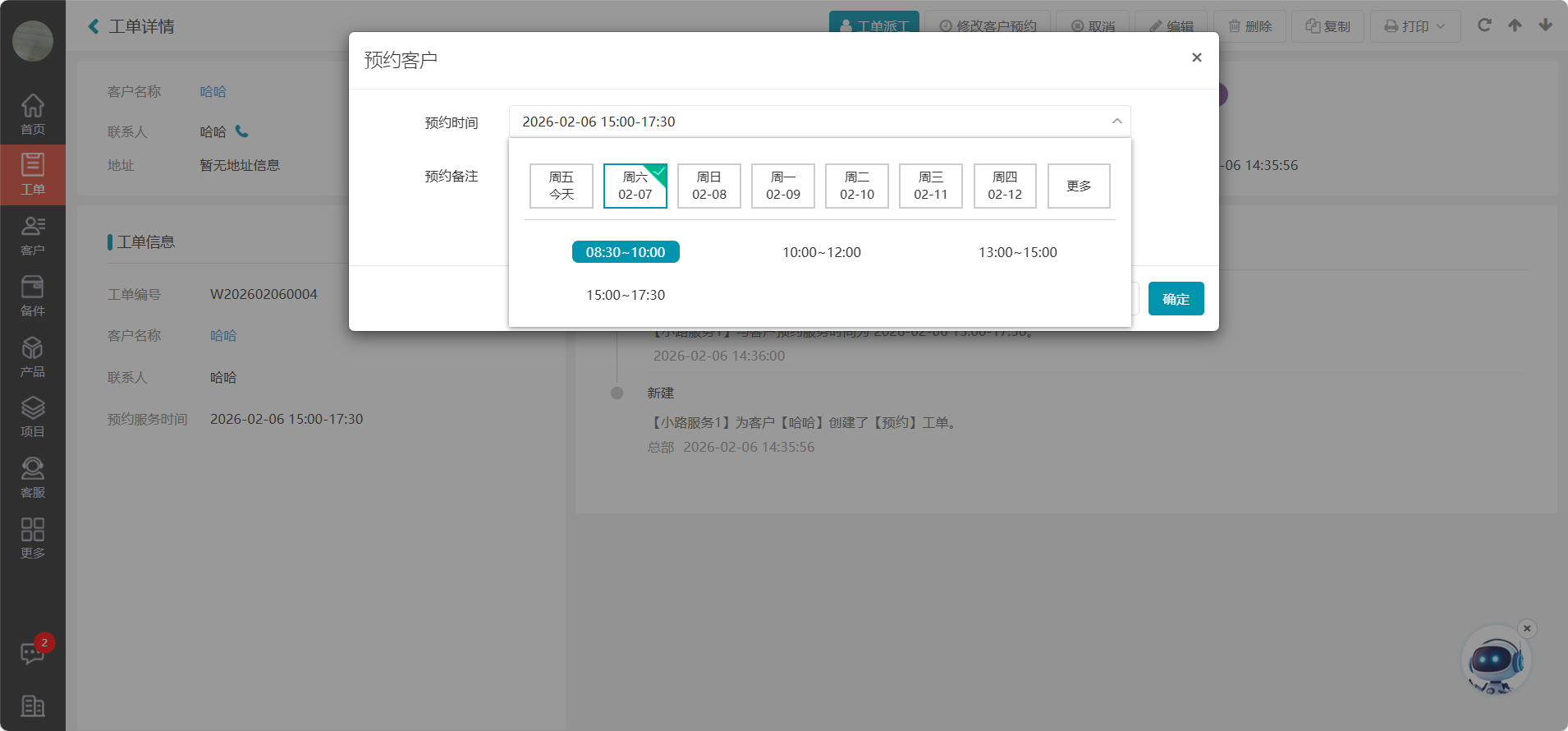 如果选择了时间段的形式,则工单进行预约客户时选择的是设置的时间段。